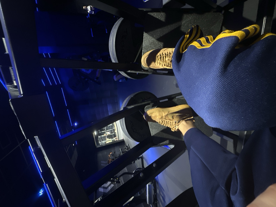 The image displays an interior view of a modern gym in Valencia, Spain, taken from the first-person perspective of an individual positioned on a leg press machine. The subject's lower legs and feet are visible, clad in dark blue athletic pants, with the right leg featuring yellow and blue striped detailing. They are wearing tan-colored Nike Air Force 1 high-top sneakers, with their feet resting on the black foot platform of the leg press machine. Large, dark-colored Technogym branded weight plates are loaded onto the machine's side posts. The gym environment is characterized by dark walls and flooring, illuminated predominantly by blue LED strip lighting along the ceiling, creating a distinct ambiance. In the background, through a doorway, a reflection in a mirror shows another individual exercising, and further gym equipment, including weight racks, is partially visible. To the far right, a person in a white shirt is partially observable behind the structure of the leg press machine.