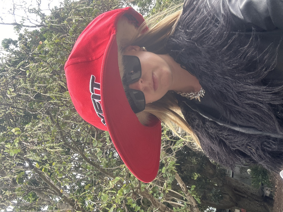 A person, seen from a low angle, is wearing a red cap with the word "FIT" visible. They have on dark sunglasses and long blonde hair that falls over a black jacket with feathery or furry embellishments. A silver, spiked necklace is visible around the neck. The background shows trees with green leaves and a slightly overcast sky.
