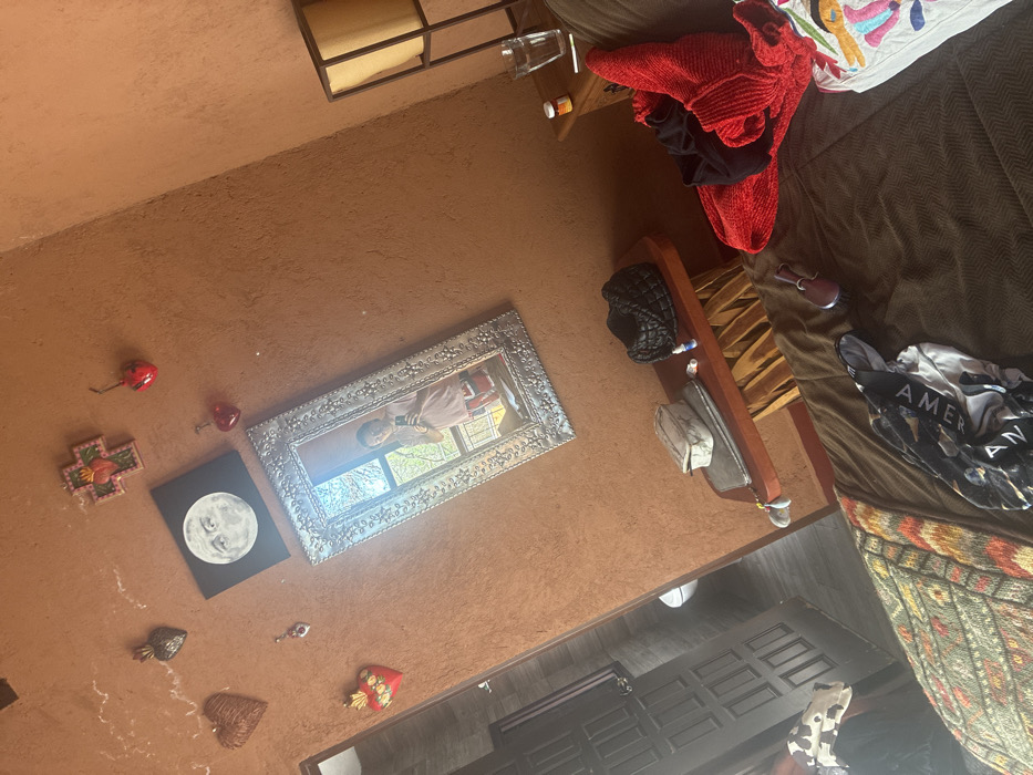 An indoor shot depicts a bed with brown covers, adorned with a red sweater and an "American Eagle" shirt. Beside the bed is a wooden stand holding a black purse, a hat, and various small items. The wall features decorative hearts, a cross, and a moon painting, all next to a silver-framed mirror reflecting a person holding a phone. A brown textured wall spans the background, with a dark-paneled door visible below the bed.