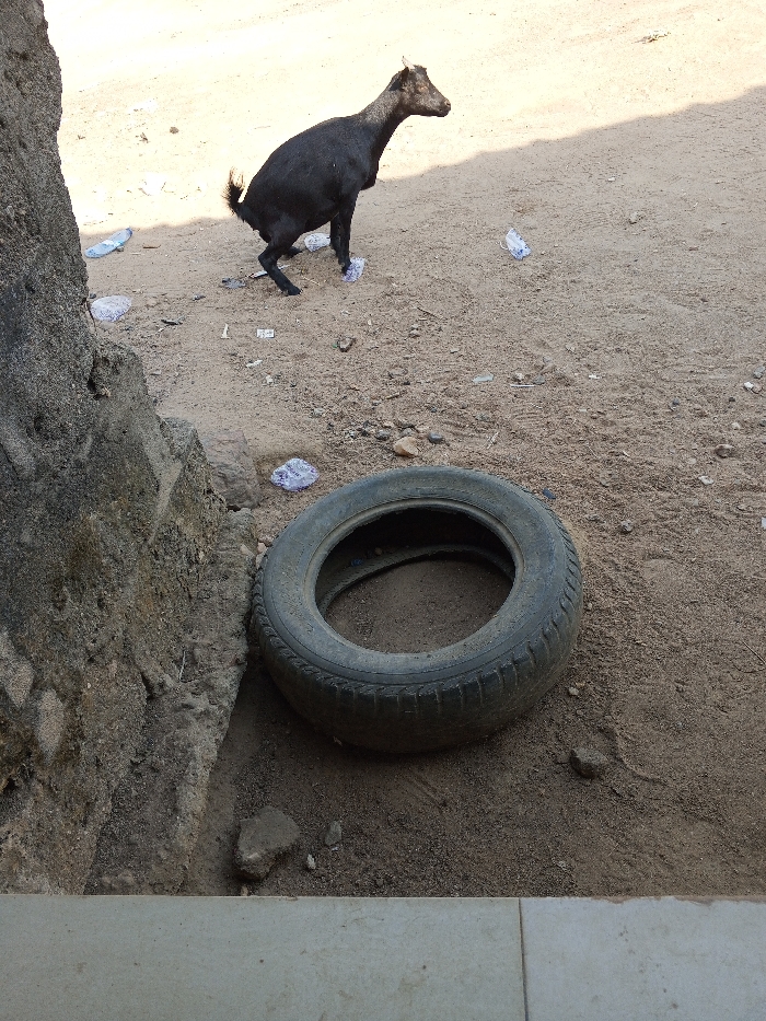 The scene in Adankolo, Nigeria, features a dusty, outdoor environment under direct sunlight. A black goat is centrally positioned in the upper-left half of the frame, captured with its hind legs bent and tail raised, facing towards the right. A worn, black tire lies flat on the sandy ground in the lower-middle section, appearing deflated and partially filled with sand. To the far left, a rough, dark-colored stone or concrete wall segment is partially visible. The light-brown sandy ground is scattered with multiple clear plastic bottles and various small pieces of litter. A distinct shadow line runs diagonally across the sand from the upper-right. The immediate foreground at the bottom edge reveals a clean, light-colored flat surface, possibly a tiled ledge or concrete step.