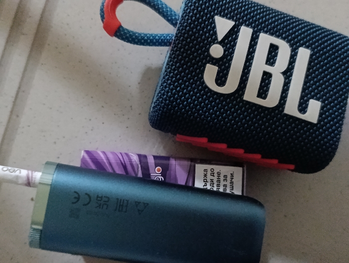 The scene depicts three consumer items arranged on a light grey, textured surface. In the upper right, a dark blue JBL portable speaker with a prominent white "JBL" logo is visible. It features a blue fabric loop with an orange accent and a red, ribbed base or grille detail. Diagonally below and to the left, a teal/dark blue metallic tobacco heating device, identified as a Glo Hyper X2 or similar model, lies with a white tobacco stick (branded "neo") partially inserted into its white/silver cap. Markings including "CE," "UKCA," and "EAC" are visible on the device's body. Partially concealed beneath the tobacco heater is a purple and white patterned pack of tobacco sticks, bearing Cyrillic text consistent with a Bulgarian health warning or product information, including the partial words "държа" and "ушачи." The environment appears to be an indoor setting within the city of Plovdiv, Bulgaria. No individuals are present.