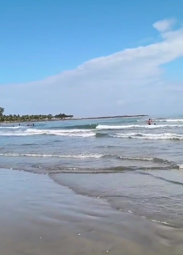 wide shot of a beach on a sunny day. The sky is a clear blue with a few scattered white clouds. In the distance, a line of trees and some buildings can be seen. The sand on the beach appears wet and reflective. The water is calm with gentle waves breaking on the shore. Several people are wading in the water. One person appears to be fishing with a long pole.