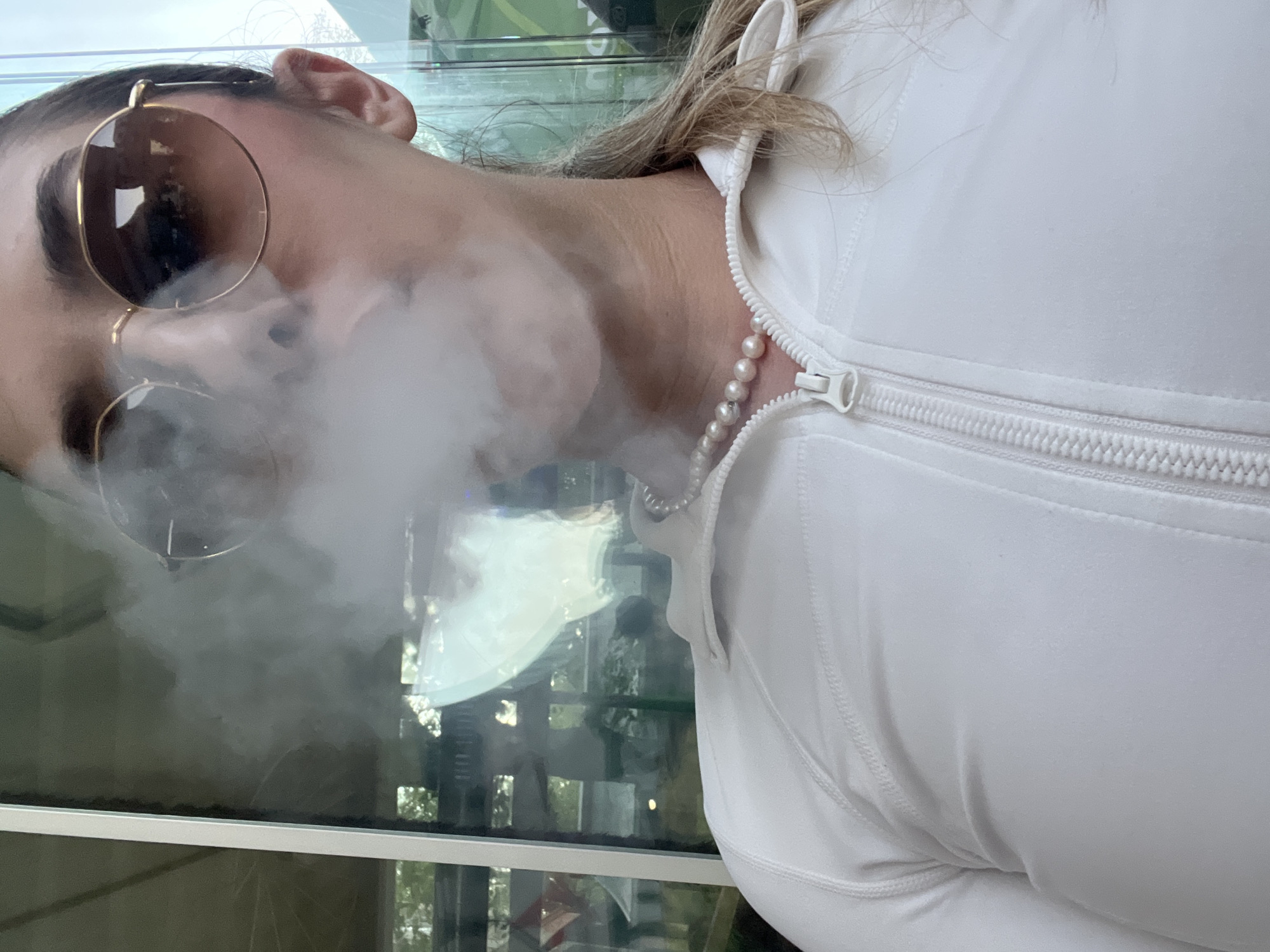 A person is exhaling a cloud of vapor or smoke. The person is wearing sunglasses with gold frames and a pearl necklace. The person is wearing a white top with a zipper. It is difficult to determine the exact location in Blagoevgrad, Bulgaria without additional contextual information.