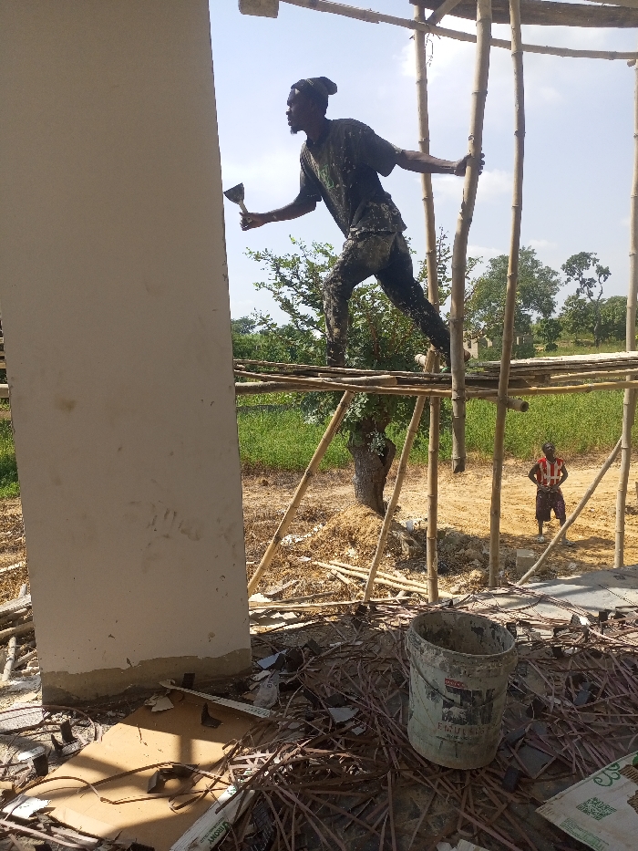 The scene depicts an outdoor construction site in Gidan Kado, Nigeria, under a clear, bright sky