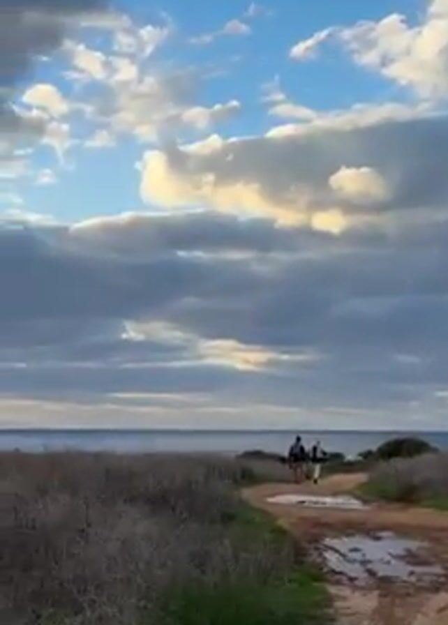 landscape near the sea. A dirt path leads towards the ocean, bordered by dry grass and greenery. In the distance, two figures are walking towards the sea. The sky is predominantly covered with clouds, with patches of blue visible. The sunlight breaks through the clouds, casting light rays down. Further along the coastline, several palm trees can be seen.