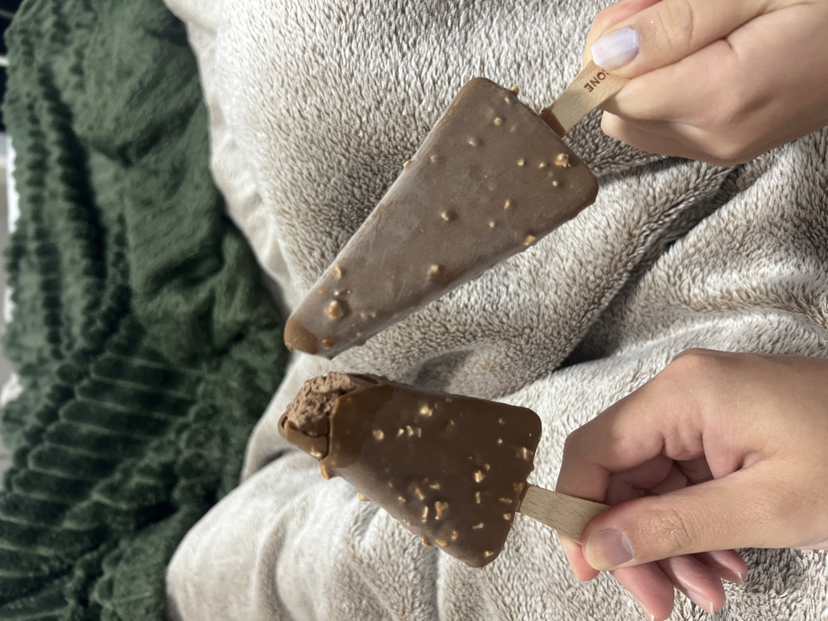 A close-up, overhead view depicts two hands holding two chocolate-covered ice cream bars against a background of blankets in Mogán, Spain