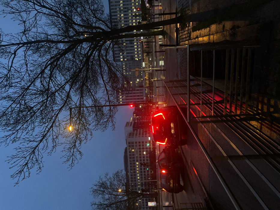 A nighttime urban scene features two cars with illuminated taillights paused at a traffic light. Towering buildings loom in the background. Bare tree branches reach into the dusk sky. A metal railing runs along the edge of the sidewalk, casting long shadows on the pavement. A street light glows softly, adding to the ambiance. The overall mood is tranquil and slightly melancholic.