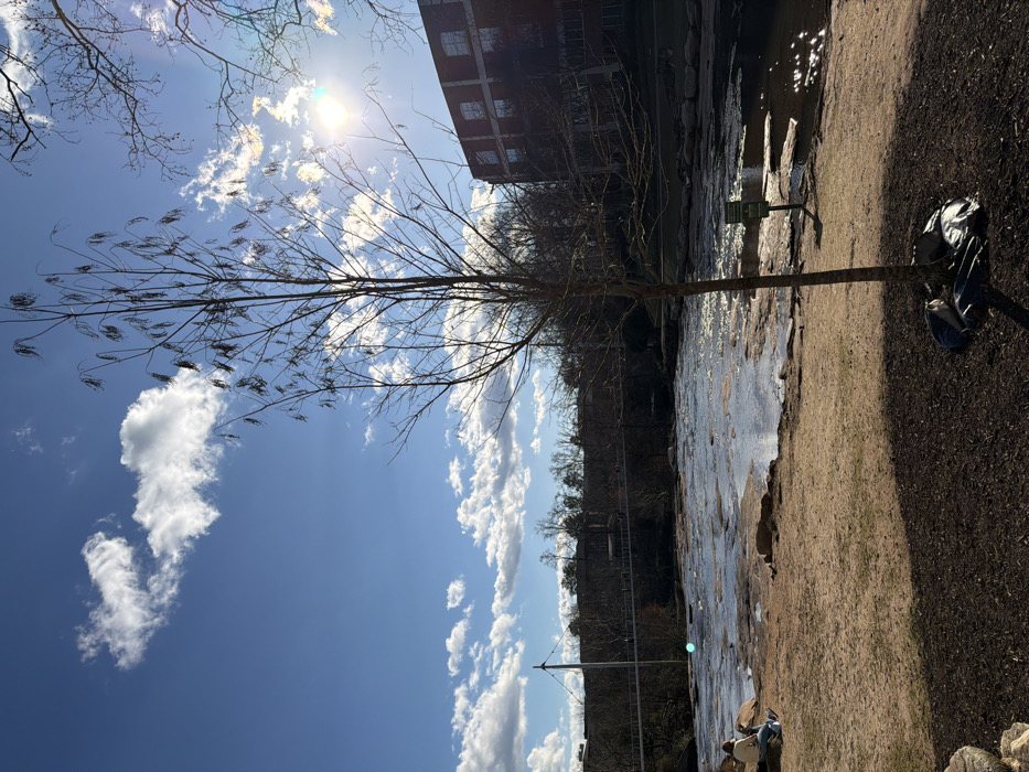 A bright, sunny day illuminates a scene with a mix of nature and architecture. Bare tree branches reach into a blue sky dotted with fluffy clouds. A brick building stands to the right, adjacent to a flowing body of water. A path lined with soil and sparse vegetation runs alongside the water. A black garbage bag sits near the path's edge. The image captures a blend of natural and urban elements.