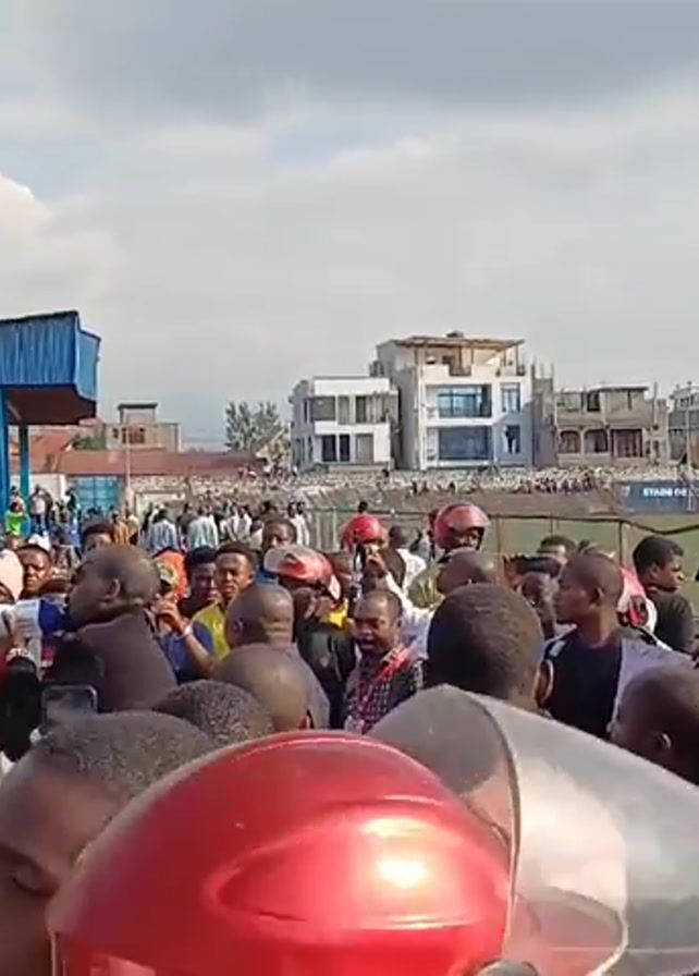 A large crowd of people stand closely packed together, many holding up phones and cameras to record the scene. The crowd is diverse, with a mix of ages and clothing styles. Some people are wearing helmets, and others are holding babies. Behind the crowd, there is a covered seating area and buildings in the distance. The sky is partly cloudy. The crowd seems excited, as evidenced by their cheering.