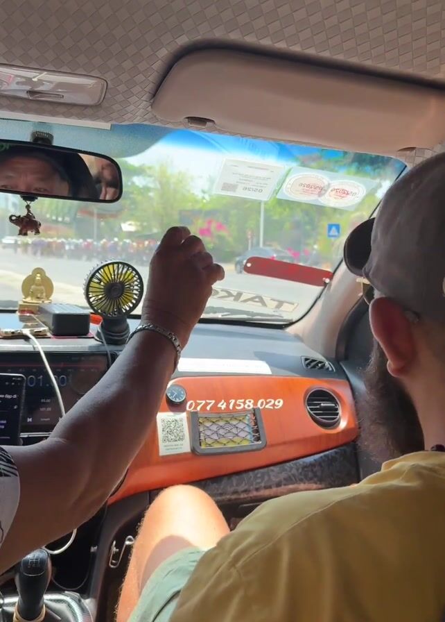 The video, shot from inside a taxi, shows a person in the passenger seat gesturing with their hand toward the windshield