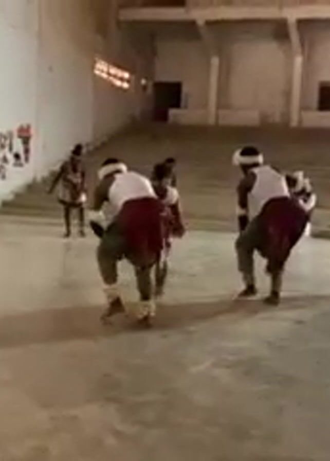 Inside a bright, concrete room, a group of at least eight people perform what appears to be a traditional dance