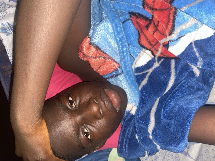 A young person lies on a bed, holding their head. A red shirt is visible. Part of a Spiderman-themed blue blanket covers the body. The bed sheet beneath is patterned. The individual's dark skin glistens slightly. Eyes are open, looking toward the camera.
