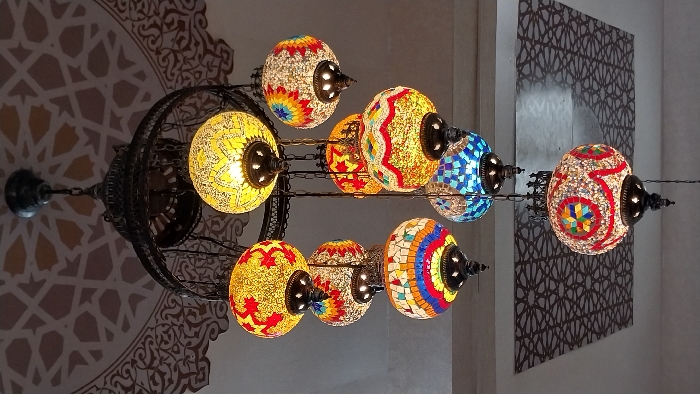 A large, ornate, dark metal chandelier is centrally depicted, suspended from a light-colored ceiling. The chandelier's multi-tiered structure supports ten individual, illuminated glass lamps hanging at varying lengths via dark chains. Each lamp is spherical or teardrop-shaped, constructed from a mosaic of small, colored glass fragments in predominantly geometric and stylized floral patterns, utilizing shades of yellow, red, blue, green, and orange. The internal illumination of these lamps emits a warm, diffused light. The ceiling features dark-toned, intricate geometric Islamic patterns, including a prominent circular design around the chandelier's suspension point and a square panel with a similar pattern visible in the lower right background. No individuals or specific actions are visible. This scene is located within a building in Banda Aceh, Indonesia.