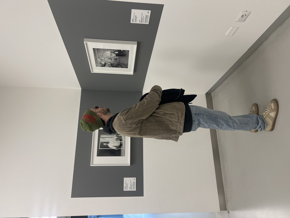 An interior view depicts a modern art gallery or museum exhibit in Milan, Italy. The walls are painted in horizontal sections: white at the top and bottom, with a dark grey band in the middle. The floor is light grey and smooth. A single male individual is present, standing in profile, facing and observing a framed artwork on the right wall. He wears an olive-green knitted beanie with a red patterned design, dark sunglasses, a black hooded sweatshirt, a light brown corduroy jacket, light blue jeans, and beige sneakers with light brown accents. He carries a dark, folded jacket over his left forearm. Two framed black and white photographs are displayed on the dark grey wall sections. To the left of each artwork is a white informational plaque with black text. The plaque beside the right artwork clearly states "Pier Luigi Nervi", "Pirelli, 1950. Milan, 1972", confirming the location as Milan, Italy. This photograph depicts an industrial or architectural interior space with a figure. The photograph on the left depicts a balding man holding a rectangular frame; its accompanying plaque is partially visible and mentions "Dan Flavin" and "FOTOGRAFIA". An electrical outlet with two distinct sockets is visible on the lower white wall section to the right. The space is brightly and uniformly lit.