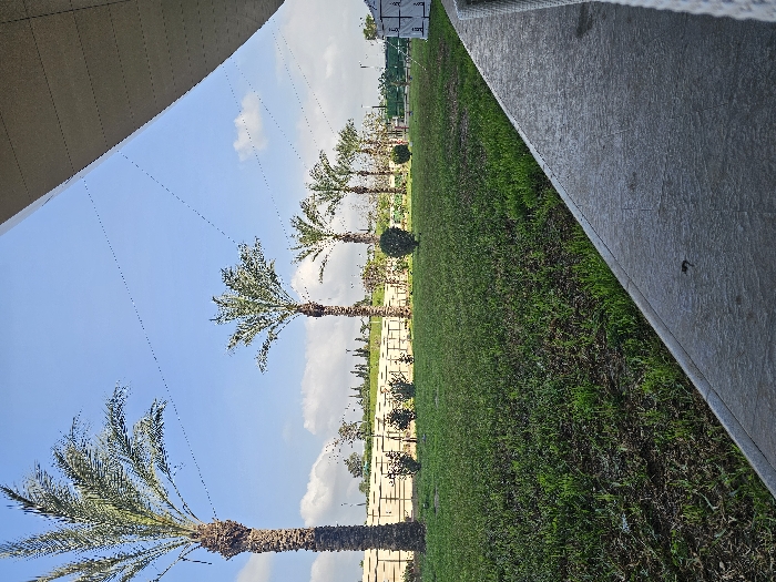 The image depicts an outdoor landscaped area in Dar El Beïda, Algeria, characterized by a mix of natural elements and structural features under a clear blue sky with scattered white clouds. In the immediate foreground, a textured grey concrete pathway or patio surface extends diagonally from the lower right towards the center, meeting a lush green lawn. The far right edge of this foreground area reveals a portion of a light-colored, possibly wicker, outdoor furniture item. Dominating the midground is an expansive area of green grass, showing variations in density. Along the rear edge of this lawn, a line of at least five mature date palm trees stands with tall, textured brown trunks and green fronds, varying in height. Behind these palms, a low, light-colored wall, possibly concrete or stone, runs horizontally. Interspersed between the palm trees and in front of the wall are smaller green shrubs. Beyond the wall and palm trees, further distant vegetation, likely trees and bushes, is visible, suggesting a broader green landscape. Several thin, dark lines, resembling wires, crisscross against the sky in the upper portion of the image, appearing to span between the tops of the palm trees and an unseen point to the right. In the upper right quadrant, the underside of a modern architectural overhang or roof structure, composed of light grey rectangular panels, juts into the frame. No individuals, explicit actions, or interactions are present in the scene.