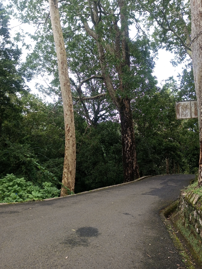 This image depicts a two-lane asphalt road curving gently to the right and ascending through a densely forested area in Padegaon, India