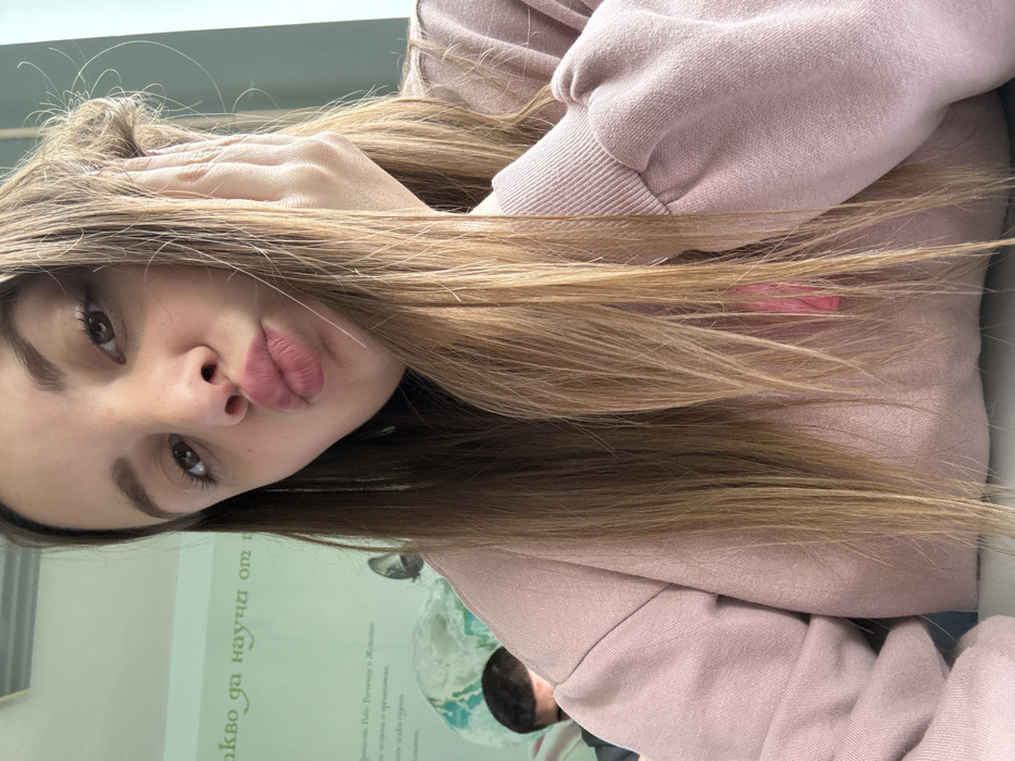 An indoor scene in Pleven, Bulgaria, depicts a young female in a selfie-style shot, looking directly at the camera with pursed lips