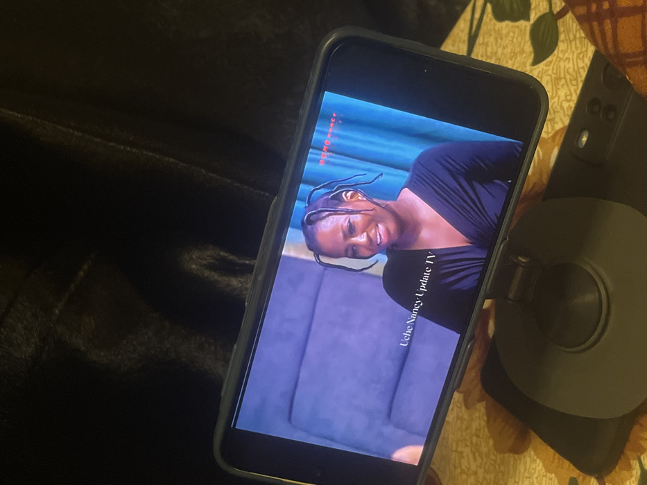 A smartphone displays a screen showing a woman with braided hair smiling. The screen reads "Uche Nancy Update TV." The phone is resting on a gray circular phone stand and a black object, possibly another phone. These objects are on a patterned surface with dark fabric partially visible in the background. The light suggests the setting is indoors.