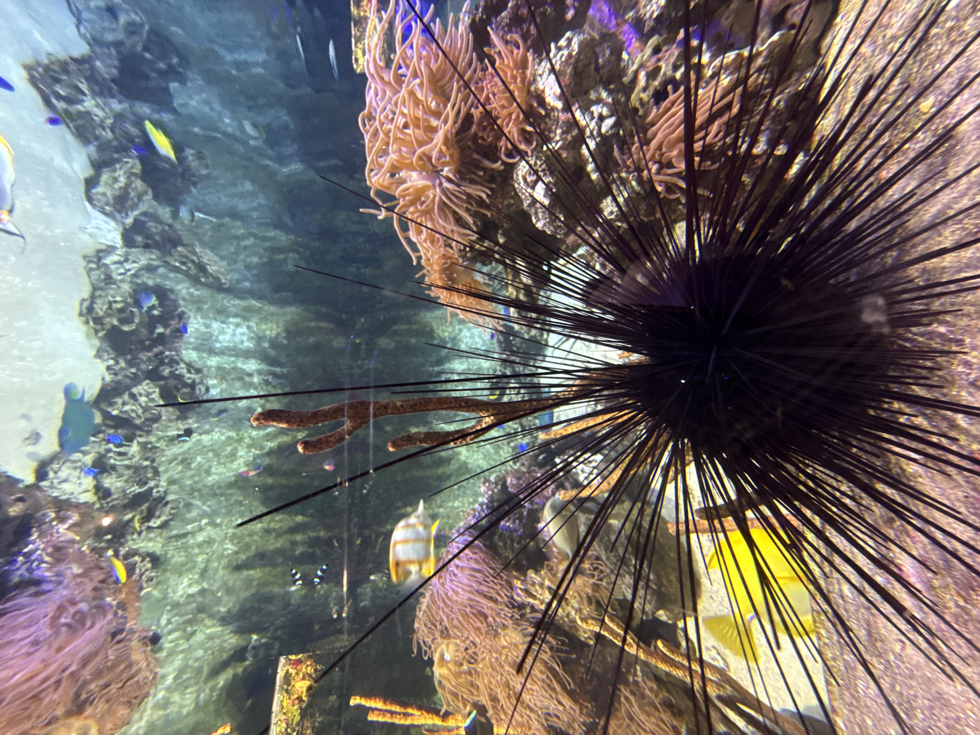 close-up view inside an aquarium tank, featuring a large, black sea urchin in the foreground with long, sharp spines radiating outwards