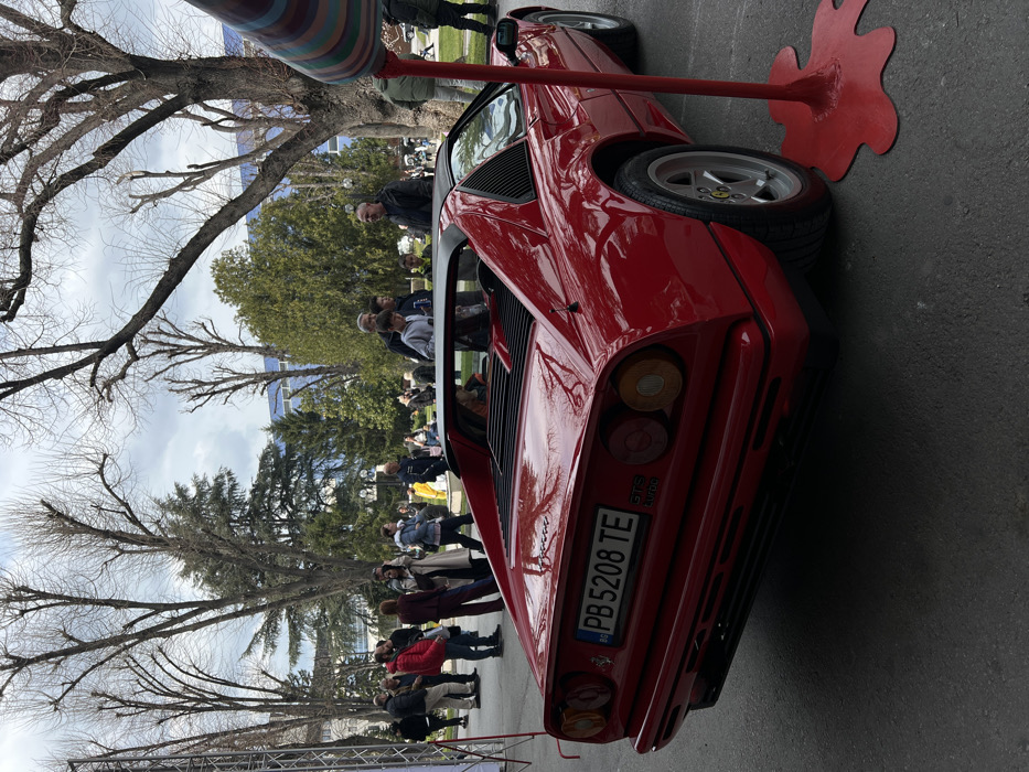 A red Ferrari 308 GTS Targa, identified by its badging and Bulgarian license plate "PB 5208 TE" (indicating Plovdiv), is prominently displayed on asphalt pavement. The vehicle is angled, showcasing its rear and right side. A young individual is partially visible in the passenger seat. To the car's immediate right stands a red, abstract sculpture featuring a melting-like base supporting a vertical pole topped with multi-colored striped cylindrical segments. The background reveals a public outdoor event space in Plovdiv, Bulgaria, populated by an estimated 20-30 individuals standing and observing. These individuals wear various casual attire. The environment is characterized by numerous tall, bare deciduous trees, suggesting late winter or early spring, intermingled with some evergreen trees. Distant buildings, one with a blue roof, are visible. A metal truss structure is partially visible on the far left. The sky is overcast.