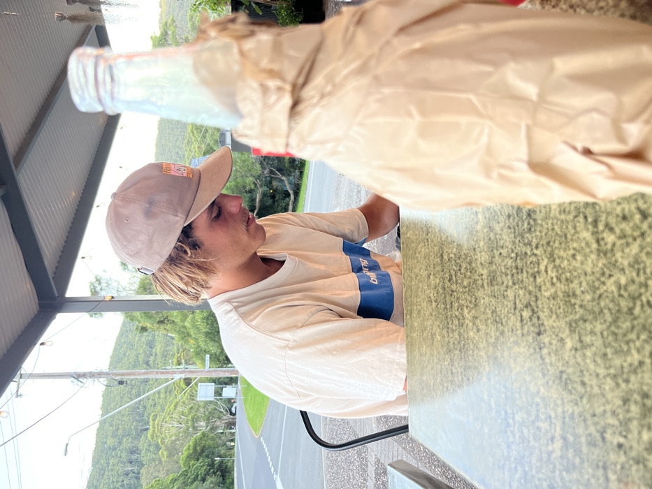 The scene is an outdoor dining area in Stanwell Park, Australia. A young adult male is seated at a speckled green and black table, positioned left of center. He has light skin, visible shaggy light brown hair, and a light mustache. He wears a beige baseball cap featuring a square patch with a colorful graphic, and a light beige t-shirt with a horizontal blue stripe across the chest, containing the word "Billabong". His gaze is directed downward and to his right, towards the table surface. In the immediate foreground, to the right, a clear glass bottle with a metallic cap is largely obscured by crinkled light brown paper or plastic wrapping. The background reveals a paved road with white markings, a wooden utility pole with wires and a street light, and dense green, forested hills. Overhead, a corrugated awning with decorative string lights is visible. The lighting is soft, consistent with late afternoon or early evening.
