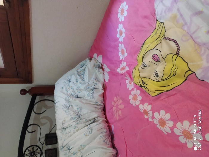 The image depicts an indoor bedroom scene located in Tétouan, Morocco. A bed is centrally featured, presenting a dark brown wooden and black wrought iron headboard with decorative scrollwork. A white pillow with a light blue and green dandelion-like floral pattern rests against the headboard. The bed is covered with a pink comforter. This comforter displays a repeating pattern of white daisies with orange centers, arranged in diagonal stripes, and a large graphic illustration of a blonde-haired female character wearing a pink necklace. The background consists of a light-colored wall, with a portion of a dark brown wooden window frame visible in the upper right corner. No individuals, actions, or interactions are present in the scene.