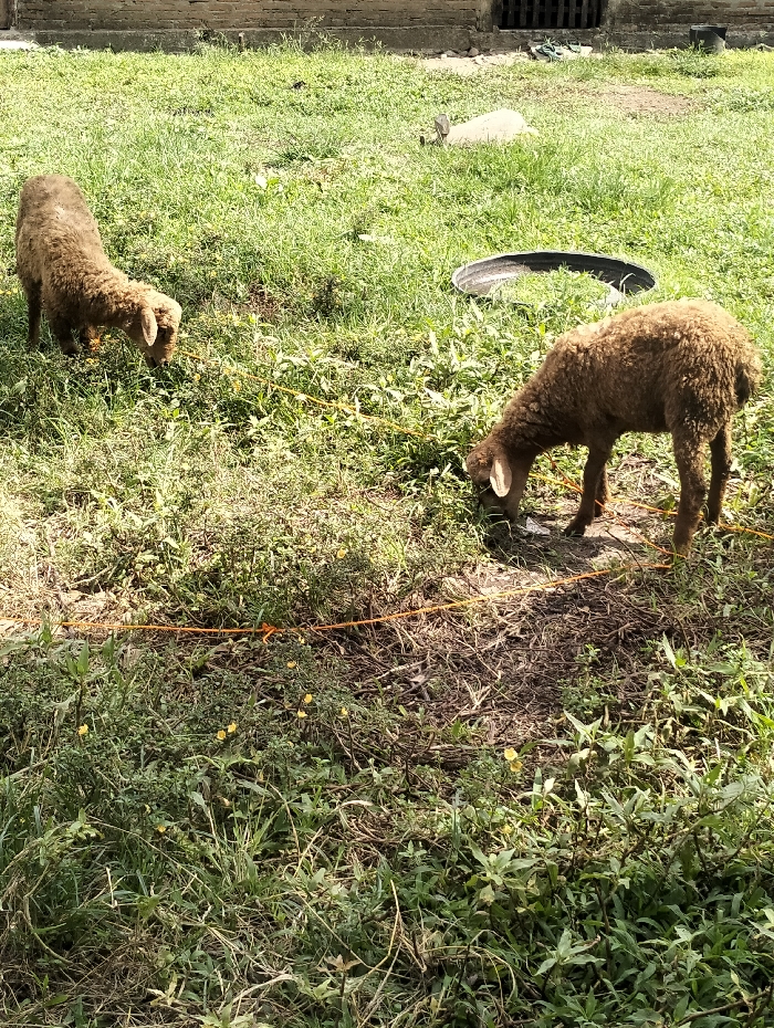 - "This image, captured in Jambo Dalam, Indonesia, displays an outdoor scene featuring two domestic sheep grazing in a field of mixed vegetation under bright sunlight" by FM-sAcf03, licensed under CC BY 4.0