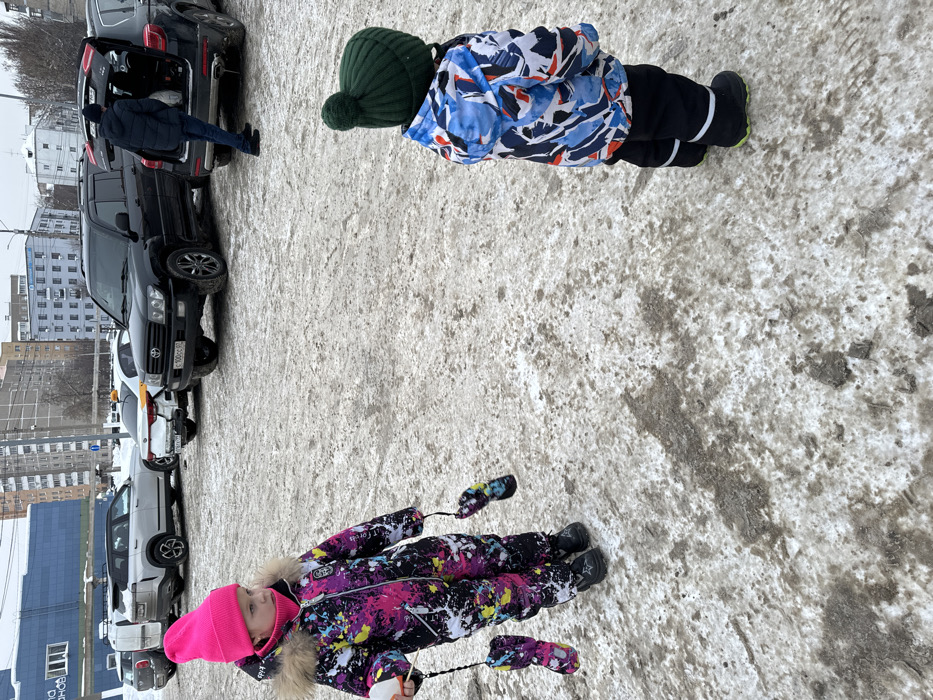 This image depicts a winter scene in a parking lot at the Voynovsky Shopping and Entertainment Center in Podolsk, Russia, identifiable by the blue building labeled "ТРЦ ВОЙНОВСКИЙ" in the background. The ground is covered with patchy, dirty snow and slush. The sky is overcast. In the foreground, two young children are present. On the left, a child, likely a girl, stands facing slightly right with a neutral expression. She wears a pink knitted beanie, a pink turtleneck, and a vibrant multi-colored (pink, purple, yellow, black, white splatter pattern) winter jumpsuit with a fur-trimmed hood. Black winter boots are on her feet. She holds a small, white, indistinct object in her right hand, and two multi-colored mittens dangle from strings attached to her sleeves. To the right, a smaller child stands with their back mostly to the camera, looking towards the parked vehicles. This child wears a dark green knitted beanie with a pom-pom, a blue, white, black, and orange patterned winter jacket, black winter pants, and black winter boots with a lime green sole accent. In the mid-ground, a row of vehicles is parked. From left to right, visible vehicles include a silver SUV, a white vehicle with a yellow roof stripe resembling a Yandex taxi (Russian license plate E990XX 99), a black Toyota Land Cruiser (Russian license plate C100CC 90), and a dark-colored SUV (possibly black) with its rear trunk open. A man in a dark blue puffer jacket and dark pants is visible next to the open trunk of the dark SUV, appearing to interact with its contents. Multi-story residential buildings are visible in the distant background.