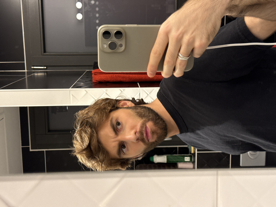 A man with brown hair and a beard takes a selfie in a bathroom. He wears a black T-shirt and holds a tan-colored smartphone with a triple-lens camera, displaying a wedding band on his finger. Behind him, black-and-white tiles line the wall and counter, which holds toiletries and a red cloth. A small window with a black frame is visible above the counter. The man's expression is slightly quizzical as he looks into the camera.