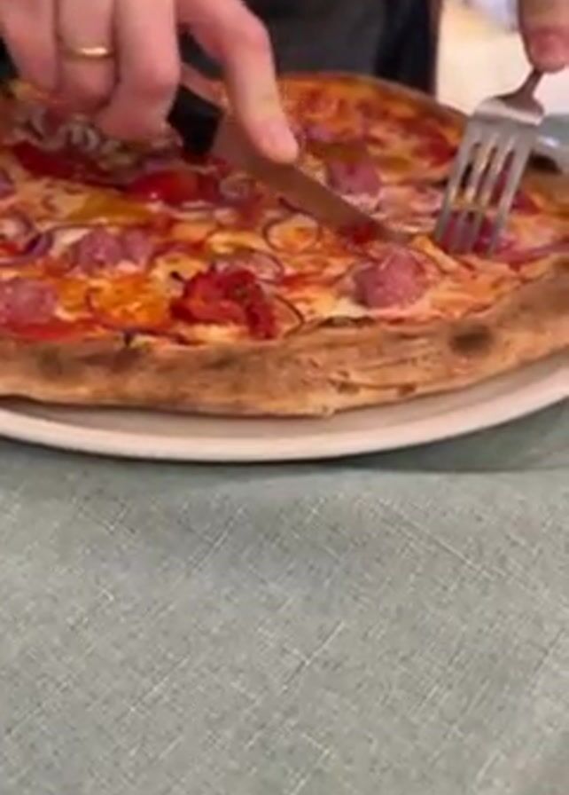 A close-up shot shows a person cutting a pizza with a knife and fork