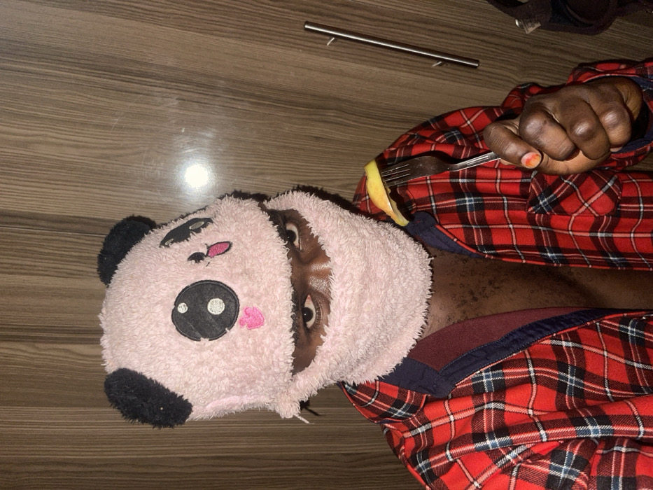 The image depicts a single individual in what appears to be an indoor setting in Unguwar Gabas, Nigeria. The subject, an individual with dark skin, is positioned frontally, captured from the mid-chest upward. Their face is largely obscured by a pink, fluffy, panda-themed balaclava-style hat, which covers the entire head and lower facial features. Only the eyes and a small portion of the upper cheeks are visible. The individual is looking directly into the camera. They are wearing a red and black plaid long-sleeved shirt, unbuttoned to reveal the upper chest. The right hand (viewer's left) holds a silver-colored fork, on the tines of which is impaled a pale yellow, translucent slice of what appears to be fruit or vegetable. The fingernail on the thumb of the visible hand shows a reddish-orange coloration. The background consists of a vertical-grained light brown wooden surface, possibly a wardrobe door, featuring a metallic vertical bar handle on the right side. A circular light reflection is visible on the wooden background to the upper right of the subject's head. An indistinct dark object is partially visible in the lower right corner of the frame.