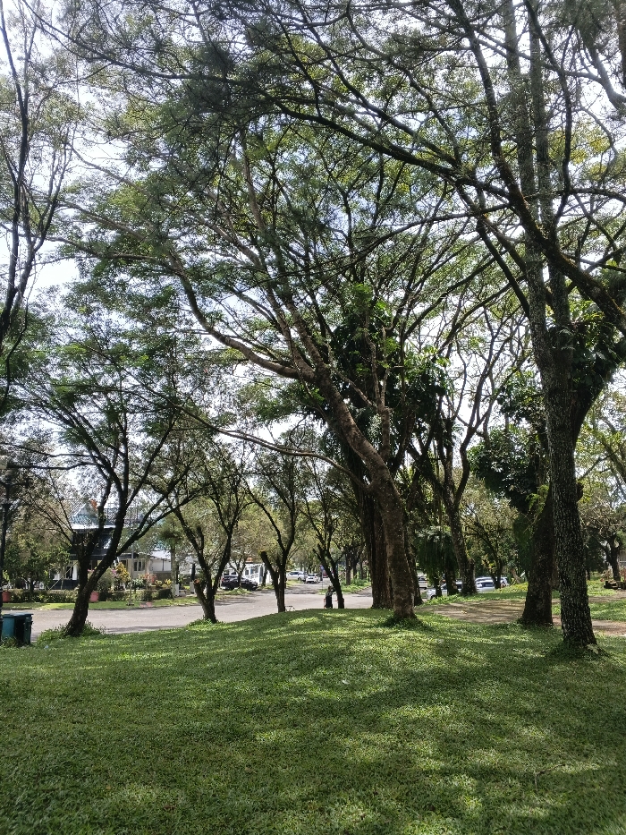 The image displays a daytime scene in ឃុំ ផាត់សណ្ដាយ, Cambodia, characterized by a well-maintained natural environment with urban elements. The foreground is dominated by a lush, green grassy expanse, exhibiting distinct patterns of dappled sunlight and shadows from overhead foliage. A dark, paved road or driveway horizontally bisects the midground, curving gently towards the right. Numerous trees of various sizes with dense green canopies and visible trunks line both sides of this road and extend into the foreground, obscuring much of the sky, which appears bright and partially overcast or hazy through the leaves. In the background, beyond the road, a light-colored building with a dark-tiled roof is partially visible through the trees on the left. Further to the right in the background, several parked vehicles, including a white van, are discernible along the road. A dark green, cylindrical trash receptacle is situated on the far left of the foreground grass, adjacent to the road. No individuals or discernible actions are present in the frame.