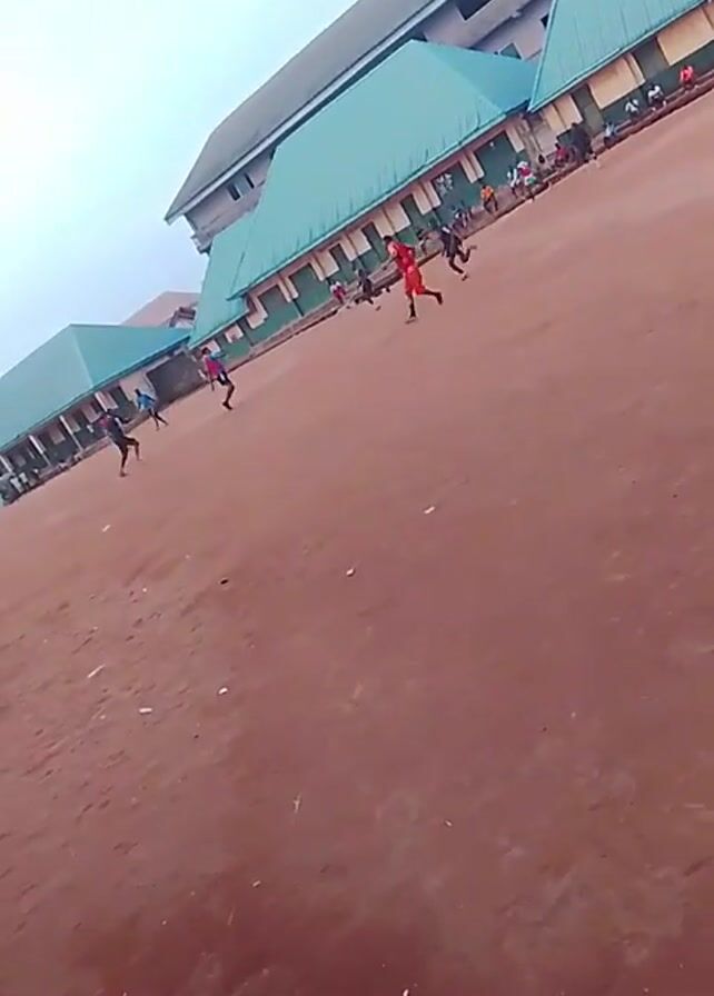 A low-angle shot shows a red-dirt field with children playing soccer. In the background are one and two-story buildings with teal roofs. The sky is overcast. Players are wearing various colors, including red, black, and blue. The camera is still and angled upwards, giving the impression of standing on the edge of the field.