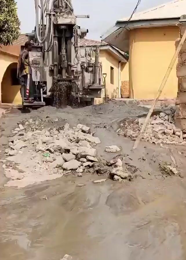 A large water drilling rig is in operation in a muddy, rocky area in what appears to be a residential zone