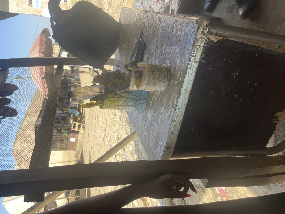 This image depicts an outdoor market or street stall scene in Dzhidu, Nigeria, under clear daylight conditions. In the foreground, a person's left forearm and hand are visible on the far left, resting against a wooden support beam. The hand features long, pointed, bright pink fingernails and appears to be loosely holding a small, indistinct object. Adjacent to this, a worn wooden table occupies the central-right foreground. Its surface is light-colored, showing peeling paint and various dark and light stains, including drips of paint. On the table, two repurposed containers hold tools: a larger blue and yellow paint-splattered metal can contains several screwdrivers, a clear plastic water bottle, and other elongated implements. A smaller, white jar, stained with orange/brown residue, sits to its right, containing additional small tools, possibly brushes or picks. A dark wallet or small rectangular object and a pen are also present on the table surface. A dark bag or backpack hangs from a support structure to the upper right of the table. Partially visible at the bottom right are dark shoes, indicating the presence of another individual near the table. Overhead, a mesh net structure is visible, supported by wooden beams. The background reveals a dusty, unpaved street or open area with scattered debris. Several single-story buildings constructed from light-colored materials are visible, some with corrugated metal roofs. Market stalls with wooden tables are discernible, and a red and white striped umbrella provides shade over one area. Two distant individuals are observed: one seated at a stall in a light blue garment, and another standing further down the street. The sky is clear and blue, indicating strong sunlight casting distinct shadows.