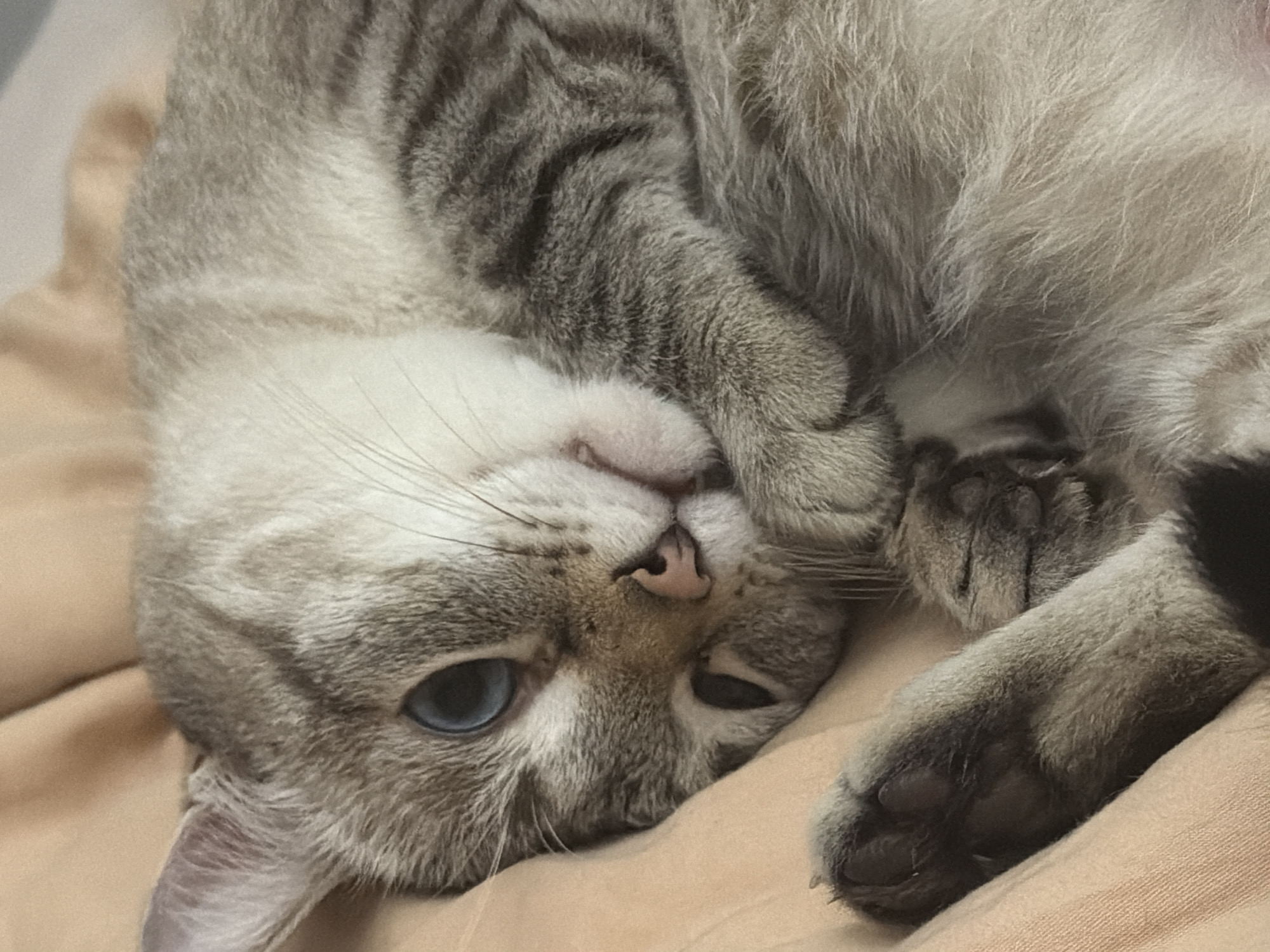 - "A domestic cat with grey and cream fur, blue eyes, and black paw pads lies upside down on a beige surface" by FM-pEr6u2, licensed under CC BY 4.0