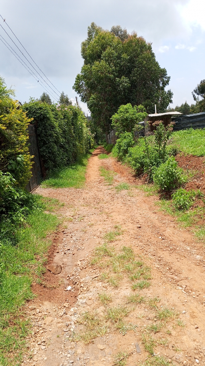 This image depicts an unpaved, reddish-brown dirt and gravel path in Ndeiya, Kenya, under a partly cloudy daytime sky