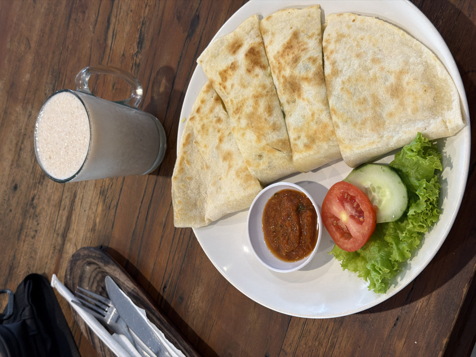 A plate of quesadillas, cut into wedges, arranged next to a small bowl of red sauce and a garnish of lettuce, tomato, and cucumber. A tall glass of what appears to be a milky smoothie sits to the left. A tray with silverware is also visible on the wooden table. The quesadillas have a slightly browned exterior. The table is made of dark wood.