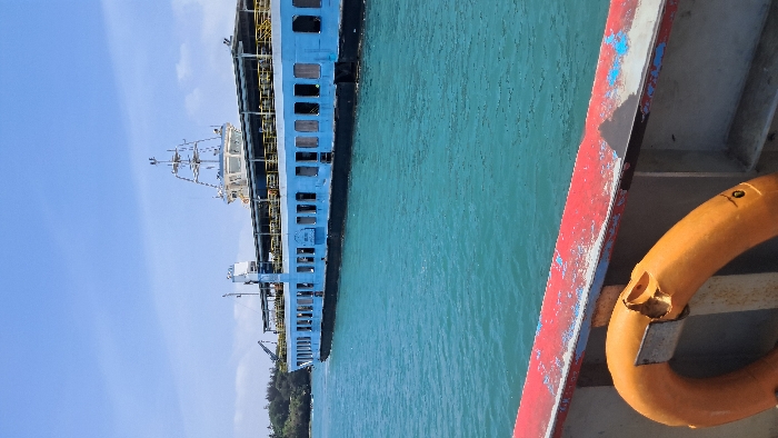 The image displays a daytime maritime scene in the Ganjoni/Shimanzi ward, Kenya, featuring a large, light-blue multi-deck ferry. The ferry occupies the midground, characterized by a dark hull, numerous rectangular windows along its side, and an upper deck with a canopy. A prominent white superstructure, housing a bridge with communication masts and antennae, rises from the vessel. The body of water is turquoise, indicating clear conditions. In the background to the left, a green, tree-lined landmass is visible, featuring a large industrial crane. The foreground provides a partial view of another vessel, from which the photograph was taken, showing a weathered red and blue painted railing with visible paint chipping. An orange lifebuoy, distinctly damaged with a significant crack on its upper surface, is mounted to this railing on the lower left. No individuals are present in the frame. The large ferry appears to be afloat, positioned, or in transit within the channel.
