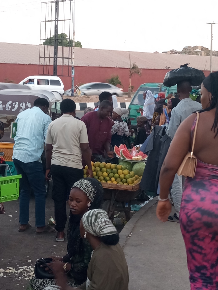 This image depicts a bustling urban street market scene in an unknown city. The background features a long, low red building with a corrugated roof under a bright sky, and a tall, empty metal billboard structure. A white van and a blurred silver sedan are visible on a paved road, while a green minibus is parked amidst the crowd. In the mid-ground, a fruit stall displays numerous oranges/citrus fruits piled on a wooden table, alongside sliced watermelon arranged on a plate atop whole watermelons. Several individuals are gathered around the stall; a man in a maroon shirt looks towards the fruit, while a man carrying a large black bag on his head walks to the right. Other pedestrians, including men, women, and children, move through the congested area. A man in a light blue shirt and jeans, and another in a beige t-shirt, are seen from behind near a motorized rickshaw (partially visible on the left with "6-699" on its side) and green plastic crates. In the foreground, two women are seated on the paved ground. The woman closer to the viewer wears a green and white patterned headscarf and a brown top, looking downwards. The woman behind her wears a black headscarf with white patterns and a dark top, holding a small dark bag. To the far right, the back of a woman walking away is visible; she wears a pink and black tie-dye dress and carries a beige shoulder bag.