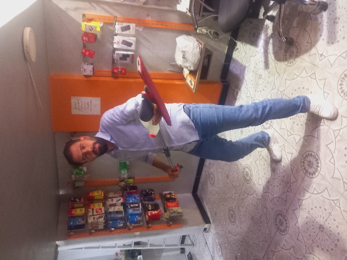 An adult male, appearing to be between 25 and 45 years old, with a beard and dark hair, stands indoors in the city of Munin, Syria. He wears a light blue long-sleeved button-up shirt, blue jeans, and white sneakers. He holds a spray mop, featuring a white reservoir, black handle, and red base, with both hands in front of his body, angled as if in a posed stance. His gaze is directed towards the viewer. The floor is covered with light-colored tiles displaying a repeating geometric pattern. The interior space features an off-white/grey wall to the subject's left and a prominent orange wall to his right. Both walls contain vertical display racks stocked with numerous small, packaged retail items, primarily appearing to be electronic or mobile phone accessories of various colors. A white sheet of paper with Arabic script is taped to the orange wall. To the right of the subject, a black office chair with chrome accents is partially visible, along with a small wooden shelf holding white bags and other items. An overhead lighting fixture is present on the ceiling. The environment indicates a commercial retail establishment.