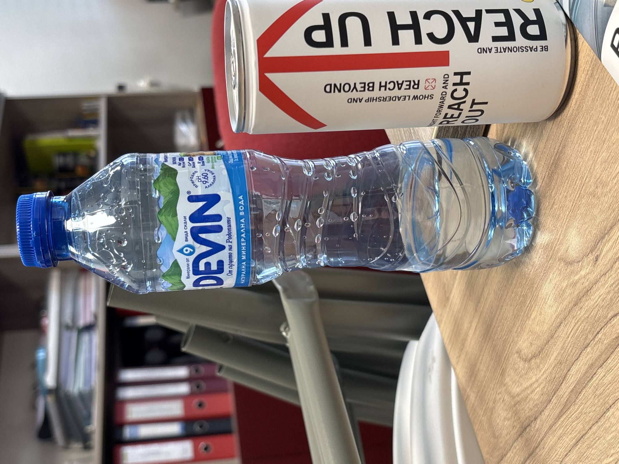 The image depicts a close-up scene located in the city of Ruptsi, Bulgaria, featuring two distinct containers resting on a light brown wooden surface. A clear plastic bottle of "Devin" natural mineral water, approximately half full with visible condensation droplets on its exterior, occupies the left-center. It has a blue screw-top cap and a white and blue label displaying "DEVIN," "НАТУРАЛНА МИНЕРАЛНА ВОДА" (Natural Mineral Water), and a pH level of "9.60." To the right of the water bottle, a white cylindrical can is present. This can features a prominent red upward-pointing arrow graphic and black text that includes phrases such as "REACH UP," "SHOW LEADERSHIP AND REACH BEYOND," and "THINK FORWARD AND REACH OUT." The background, rendered in soft focus, reveals an office environment, including a light-colored chair partway visible on the left, grey metallic structures of office furniture, and a shelving unit behind, stocked with multiple red binders and various papers. No individuals are visible in the scene.