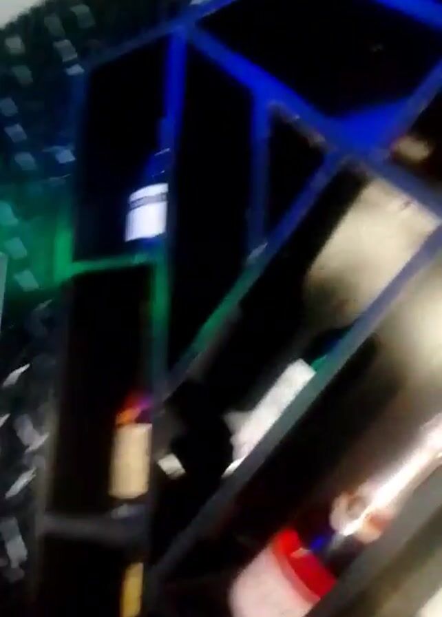 The camera moves erratically, focusing on a tilted view of shelves containing various bottles, likely liquor. The bottles have different shapes, sizes, and labels, with some being clear and others dark. The shelves are illuminated with blue and green lights. Due to the camera's movement and blurriness, details are difficult to discern.