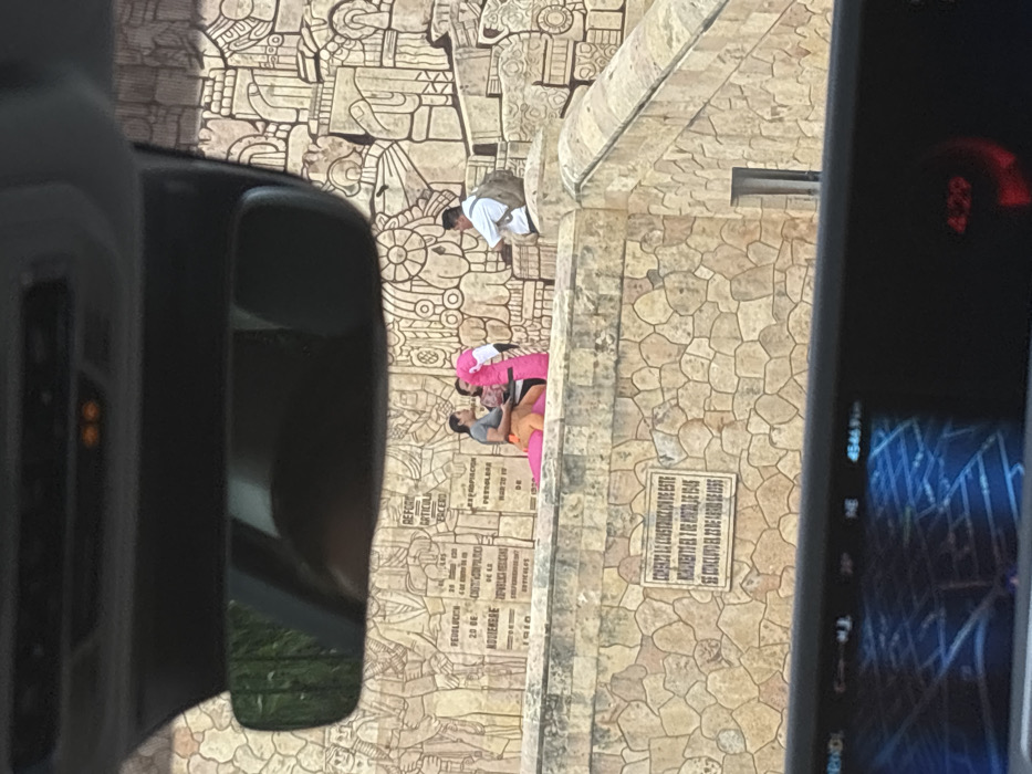 The image captures an outdoor scene at the Monumento a la Patria in Mérida, Yucatán, Mexico, viewed from inside a vehicle