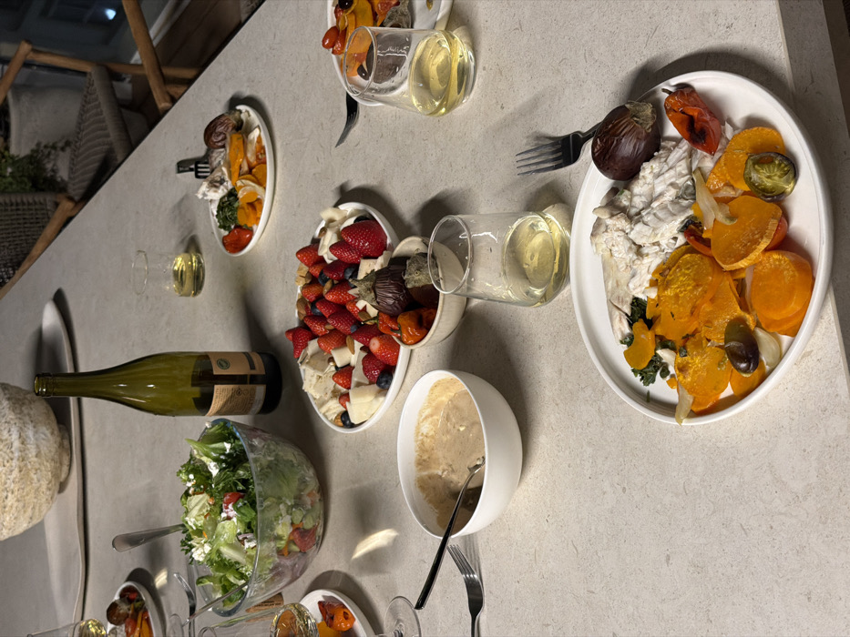 A dining table, likely set for an evening meal in Eilat, Israel, is centrally depicted. The light-colored, possibly stone or composite, tabletop holds an array of food and drink. A large glass bowl filled with green salad, including lettuce, tomatoes, and a creamy dressing, is positioned towards the left. A partially empty green glass wine bottle stands next to it. Several white plates are arranged around the table: one contains a generous assortment of fresh strawberries, blueberries, banana slices, and what appears to be cheese or nuts. Another white bowl holds a light brown, creamy dip or sauce, with a spoon resting inside. Multiple clear, stemless wine glasses, each containing a pale yellow liquid consistent with white wine, are distributed across the table, along with a smaller glass also holding wine. Individual white plates feature portions of roasted vegetables, including orange slices of what appears to be squash or sweet potato, green leafy vegetables, and roasted red onions. Some plates also contain cooked white fish or poultry. Forks are present on or near several plates. The background is softly blurred, revealing parts of wooden chairs with woven backs and a glimpse of an outdoor nighttime environment with distant lights.