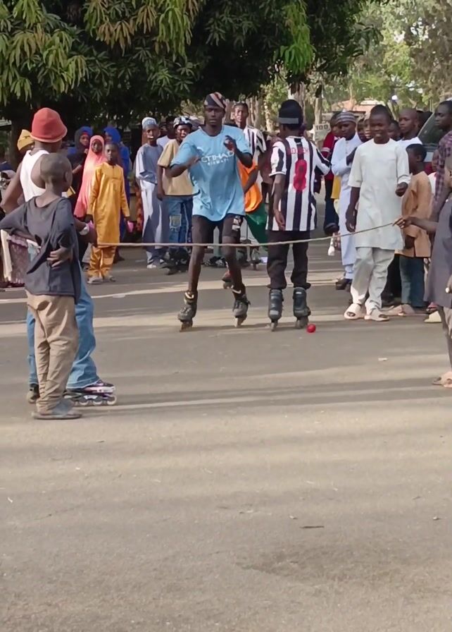 The video captures a scene of people gathering outdoors, seemingly to witness or participate in a roller-skating activity
