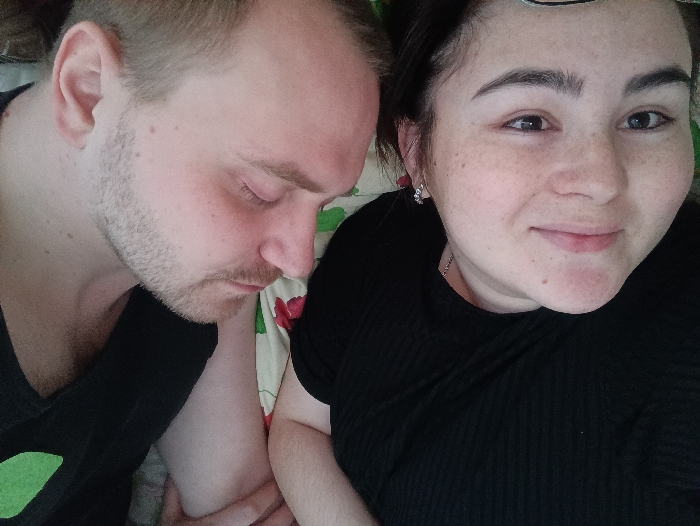 The image, taken in the city of Посад, Russia, depicts two individuals in a close-up, overhead view, likely indoors. On the left, a Caucasian male with short, light-colored hair and a light beard is shown with his eyes closed, head tilted downwards and slightly to the right. He wears a black t-shirt with a visible green detail on the left shoulder area. His left arm is visible, bent at the elbow, near the bottom center. To the right, a Caucasian female with dark hair and freckles is shown looking directly at the camera with a slight smile. She wears a black ribbed top and has small silver-colored earrings and a thin necklace chain. The two individuals are positioned side-by-side, with the male's head resting near the female's left shoulder area. The background consists of a patterned fabric, likely bedding, featuring green leaves and red floral motifs on a light-colored ground.