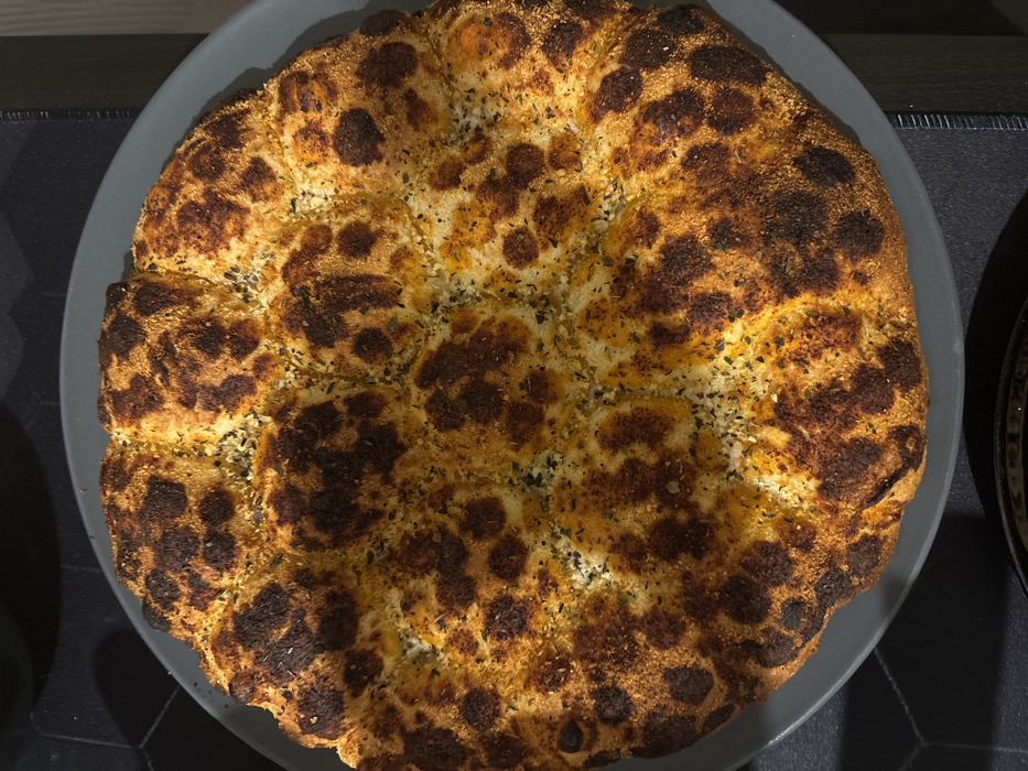 - "A single, round, baked flatbread-like item with an uneven, dimpled surface is centrally positioned on a matte grey circular plate" by FM-TCzP42, licensed under CC BY 4.0