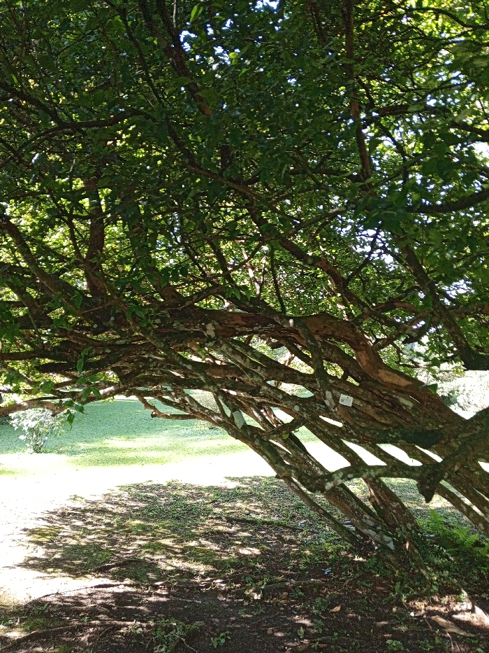 The image displays a tree with a dense canopy of green leaves, filtering sunlight onto the ground below
