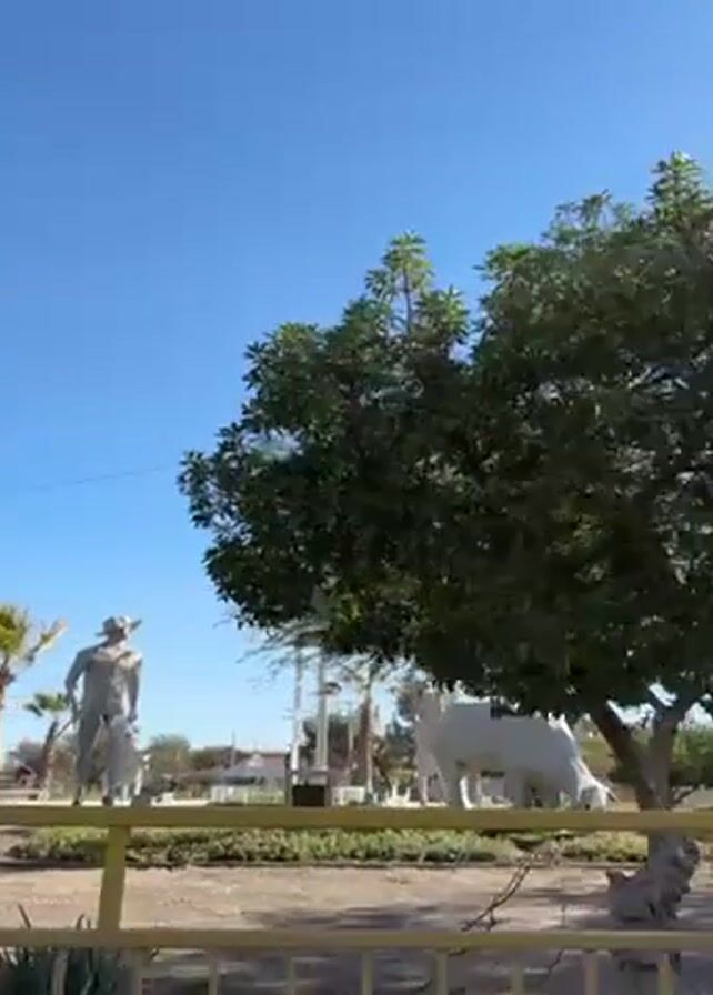 The video depicts a public park or open space on a bright, sunny day, with a clear blue sky overhead. The foreground features a yellow metal fence, partially obscuring the view of the park's interior. Visible within the park are several white statues, including one of a cowboy and another of a cow or bull. There is a large, green tree whose leaves fill a significant portion of the frame, partially obstructing the view of the statues. A tall lamppost stands near the tree. There are other, smaller trees and plants visible in the background. A black figure appears briefly walking behind the white cow.